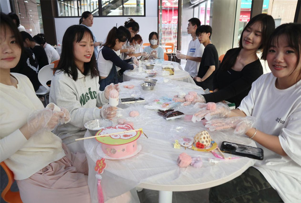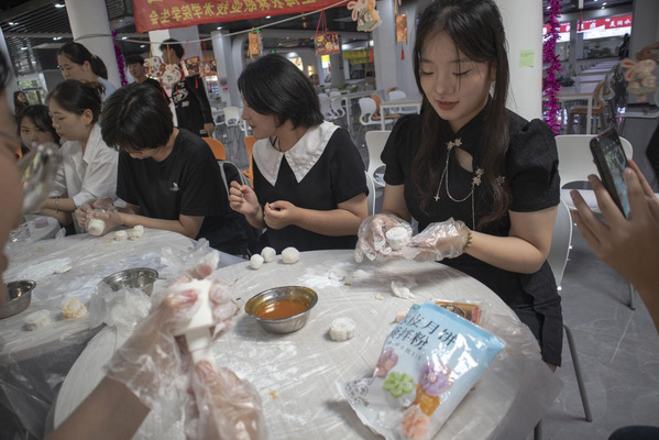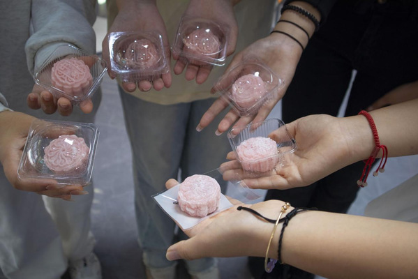 冰皮月饼制作。同学们在工作人员的指导下一起制作冰皮月饼,用精心挑选的饼印,印出漂亮的形状和印花。一个个精致优美的月饼在大家的巧手下诞生。现场一片欢声笑语,同学们一起感受来自农林大家庭的团圆气氛。