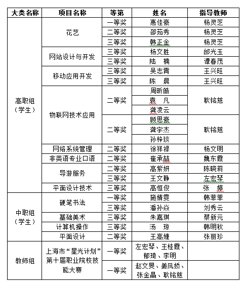 从上海市教委获悉,上海市“星光计划”第十届职业院校技能大赛获奖名册已公示,我校师生成绩突出,荣获21个奖项,共44人获奖。高职组学生获奖14项,其中一等奖1项、二等奖6项、三等奖7项;中职组学生获奖5项,其中一等奖1项、二等奖1项、三等奖3项;高职组教师教学技能类荣获2项一等奖。
