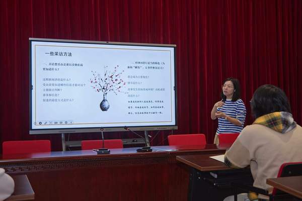 培训上,王记者介绍了自己的工作经历、工作背景,以及本次讲座的目标、内容和重点。她结合自身工作经验,分享了采访和新闻写作方面的经验和技巧,强调了如何采和如何写的重要性。通过实际案例和互动讨论,详细介绍了新闻写作的基本原则和技巧,分享了有效的采访方法和写作技巧,以事实准确、客观公正的重要性。学生们积极参与讨论,与王记者深入交流互动。