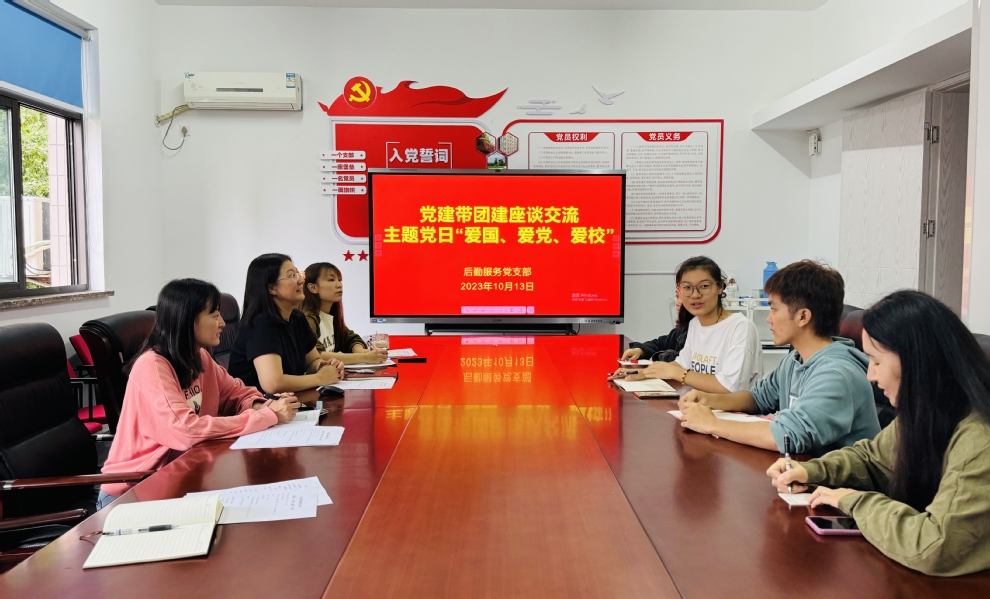 10月13日下午,后勤服务党支部在20号楼405室开展“爱国、爱党、爱校”党建带团建座谈交流会,支部党员代表参加。会议由党支部书记袁少英主持。