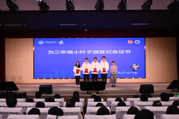 分享交流环节,2022届校友四年级“小叶子”朱美婷、三年级“小叶子”裴泽凯、本届进博会长期管理岗志愿者二年级“小叶子”顾煜禛分享了他们的进博故事,为即将出征的第六届“小叶子”们带来宝贵的经验。