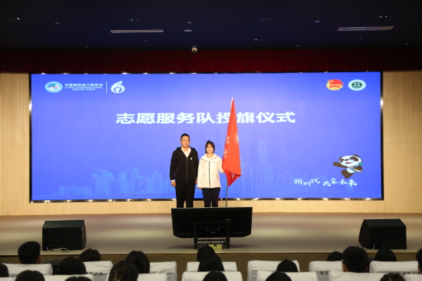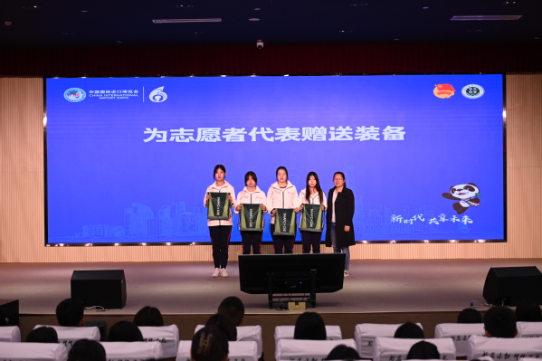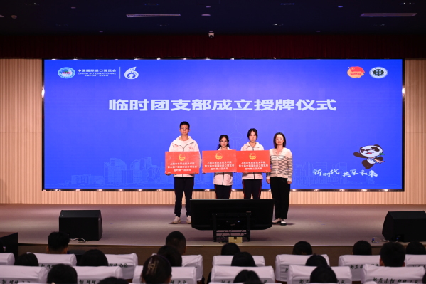 仪式上,学工部部长高东菊为志愿者代表赠送装备,学工部副部长张莎莎为临时团支部授牌,团委兼职副书记齐雪飞为三年级小叶子颁发纪念证书,团委进博会工作负责老师刘雅姗作前五届进博会志愿服务工作总结、介绍本届工作筹备情况。