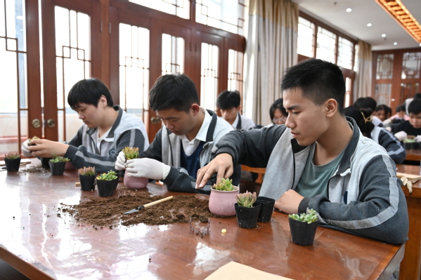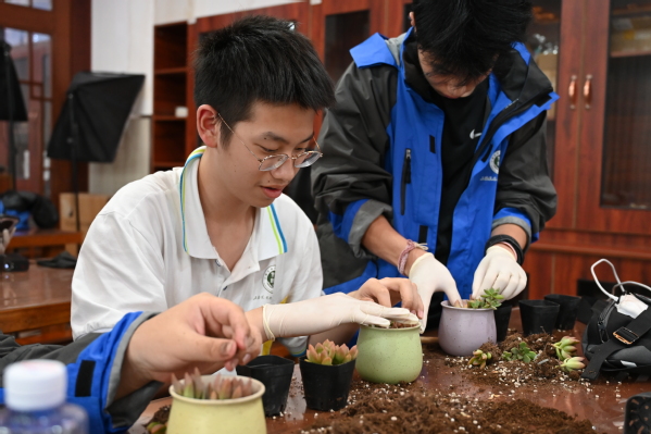 在老师的指导下,学生们亲自操作实践,制作出一盆盆多肉艺术盆景。
