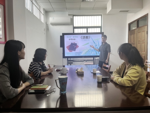 读书分享会上,张贵鹏同学分享了余华作品《活着》的读后感,与会师生分享了对该作品的感悟。在一个小时的交流分享中,大家都投入其中,感知《活着》带来的哲理和思考。樊清誉老师对张贵鹏同学分享过程中的不足给出指导意见,力求在面对全体社团成员的第一次分享上,能够更加深刻解读该作品,让每位社团成员从中借鉴如何分享一本好书,从中受益。