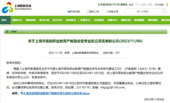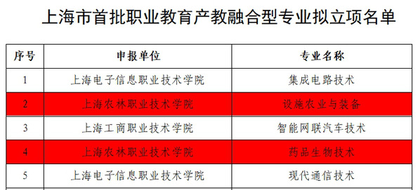 日前,上海市教育委员会职教处发布《关于上海市首批职业教育产教融合型专业拟立项名单的公示》,设施农业与装备、药品生物技术两个专业立项为上海市首批职业教育产教融合型专业,培育建设周期为3年,此次共立项20个专业。