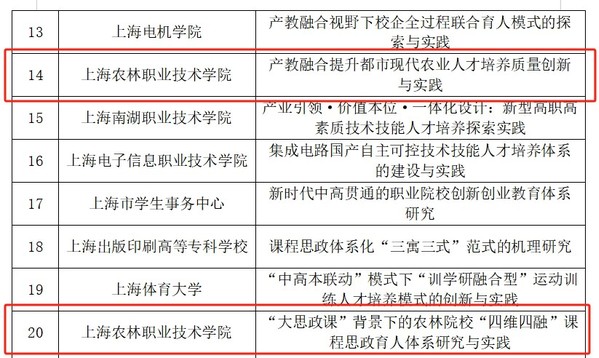 日前,上海市教育委员会职教处发布《关于2023年上海职业教育重点教改项目拟立项名单的公示》,我院2个项目获2023年上海职业教育重点教改项目立项,分别是《产教融合提升都市现代农业人才培养质量创新与实践》《“大思政课”背景下的农林院校“四维四融”课程思政育人体系研究与实践》。