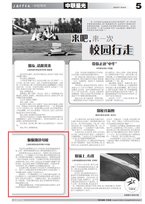 近日,动医(贯)232班叶欣逸同学以一篇温馨感人的作文《偷偷溜进母校》登上备受关注的上海中学生报。这篇作文展现了叶欣逸同学对母校的深厚感情。