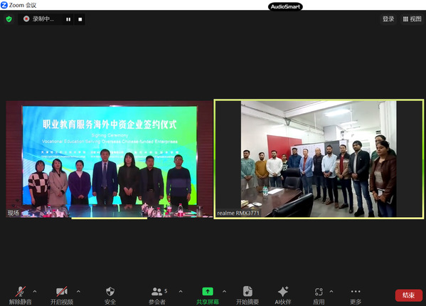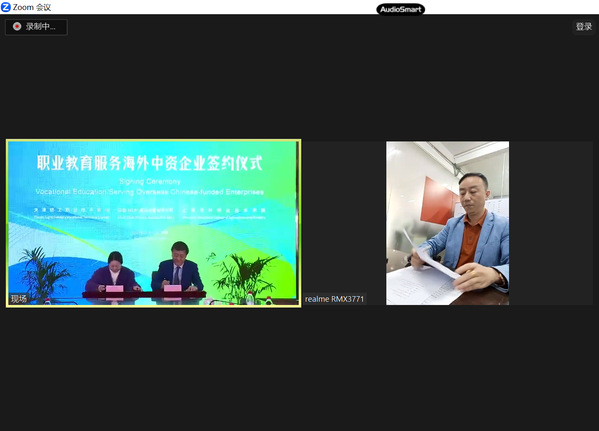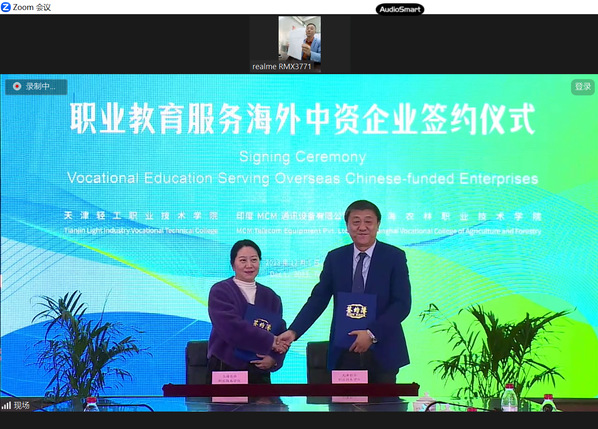 最后,两校与印度MCM通讯设备有限公司采用线上线下相结合的形式举办“职业教育服务海外中资企业”签约仪式,印度MCM通讯设备有限公司总经理李格及企业印度员工代表在线参加仪式。仪式上,三方共同签署了《中文+职业技能培训项目合作协议》。