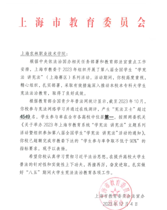 近日,从上海市教育委员会获悉,学院在第八届全国学生“学宪法 讲宪法”(上海赛区)系列活动中,以在全市各高校中位居第一的学生参与率,荣获上海市教育委员会通报表扬。