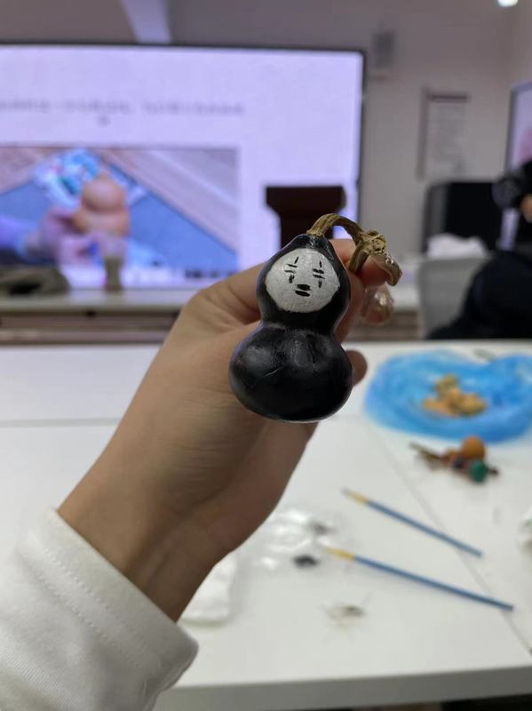 葫芦彩绘开始前,农经221傅欣怡讲解了葫芦文化,介绍了宝山区月狮村的葫芦非遗技艺——葫芦烙画和葫芦雕刻,讲解了葫芦彩绘的步骤。