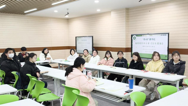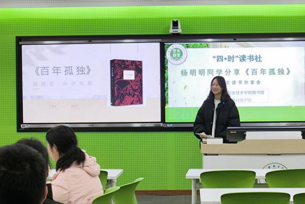 12月27日,在综合楼403智慧教室,图书馆举办“四·时”读书社第四次读书分享会,也是2023年最后一次读书分享会,由环境232班杨明明分享加西亚·马尔克斯著《百年孤独》。图书馆馆长、读书社指导老师樊清誉与读书社成员会聚一堂,共同感受《百年孤独》的魅力。读书社社长徐玲爱主持分享会。