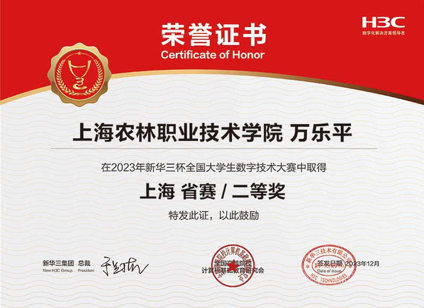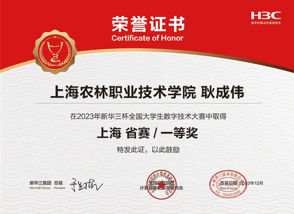 近日,2023第十三届“新华三杯”全国大学生数字技术大赛上海市赛获奖名单揭晓,智慧农业工程系学生获一等奖、二等奖各1项。