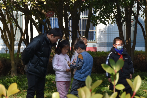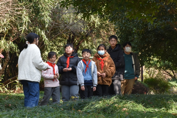 活动伊始,20名小朋友自由组合为5个小组,每个小组配有一名旅管专业二年级的学生作为助教。在助教的带领下,孩子们游览探秘校园,主要探秘对象为校园内分布种植的“岁寒三友”、“花中四君子”以及正在热烈盛放的被列为中国十大名花的“山茶花”和“腊梅花”。观察植物的过程中,助教们一个个趣味故事、一首首著名诗词激发了小朋友们对种种植物的浓厚兴趣,让小朋友们沉浸式地感悟到了一草一木的奉献精神。