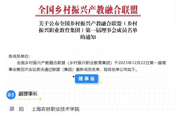 近日,全国乡村振兴产教融合联盟第一届理事会成员名单公布,学院顺利当选副理事长单位,党委副书记、副院长邵阳当选副理事长。