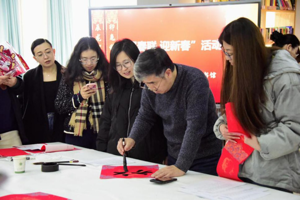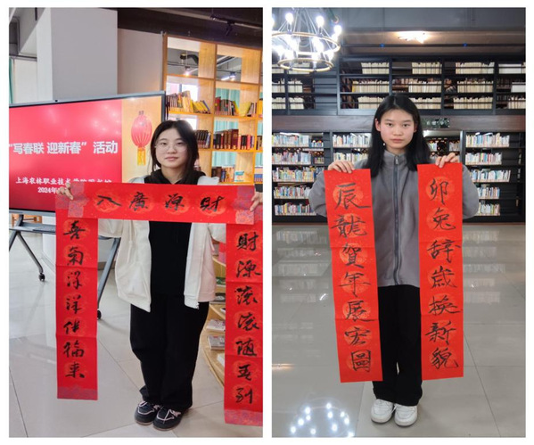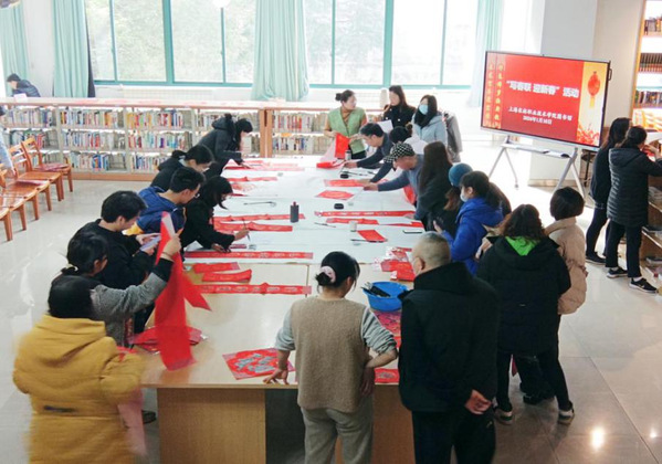 活动邀请中国书法家协会会员、上海市书法家协会楷书专业委员会会员郑小云和上海市书法家协会会员、上海市美术家协会会员朱柳杨两位书法名家为师生现场书写春联及“福”字帖。在现场,两位书法名家凝神聚气,挥毫泼墨,笔走龙蛇,一个个苍劲有力、富有美感的毛笔字跃然纸上,一副副寓意吉祥的大红春联和“福”字墨香四溢,为师生们送来新春的祝福。