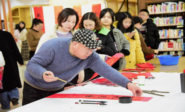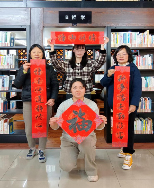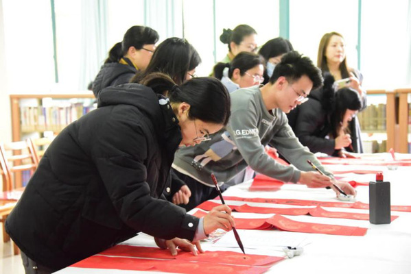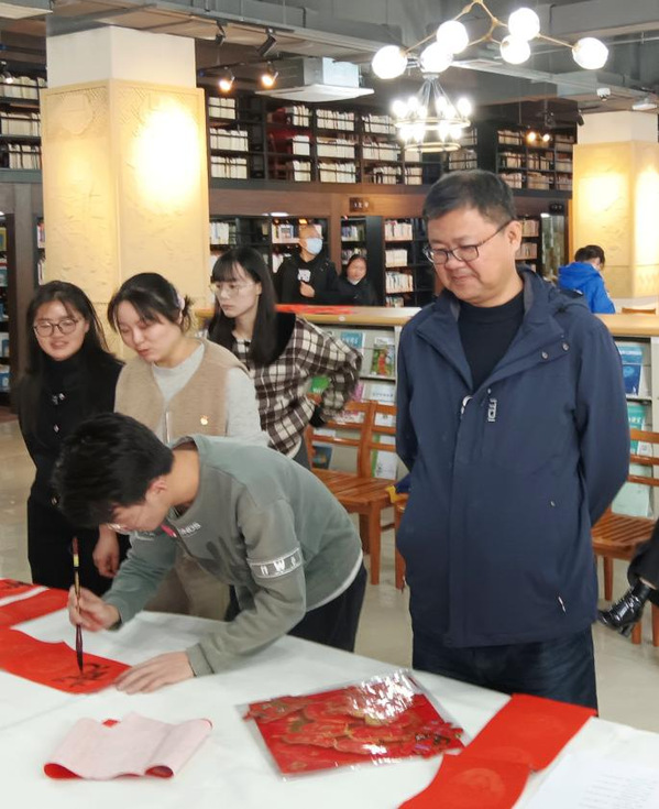 写春联、贴春联,是年味的一个载体,也是人们祝福美好生活的一个方式。为弘扬传统文化,营造校园喜庆祥和的节庆氛围,在2024年新春佳节来临之际,1月16日,图书馆在综合阅览室举办“写春联 迎新春”活动,为师生们送上真切的新春祝福和文化年礼。党委副书记、副院长邵阳与200余名师生们共同体验书写春联的乐趣。