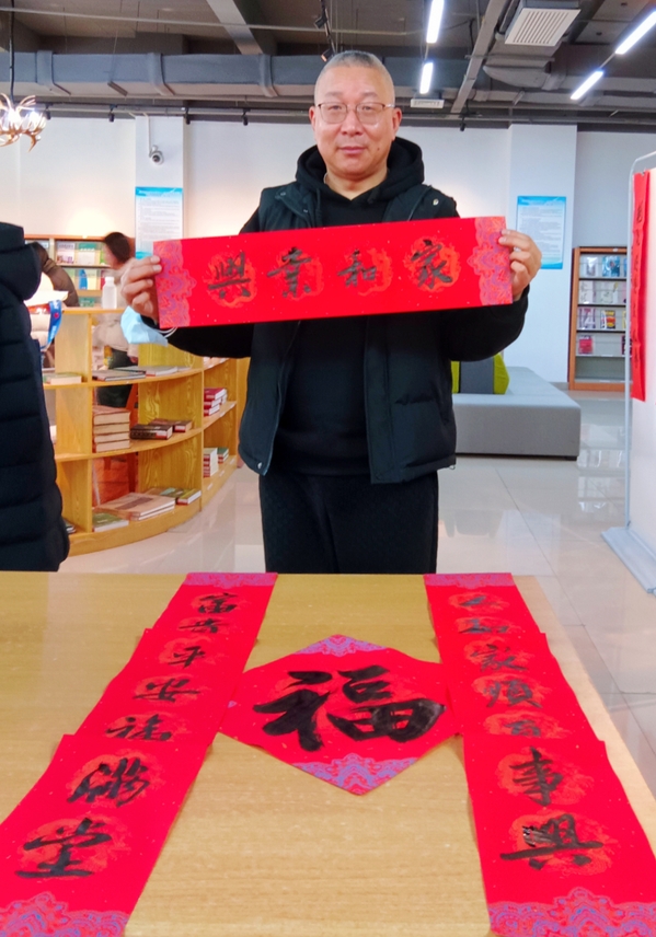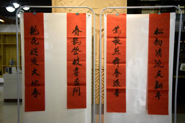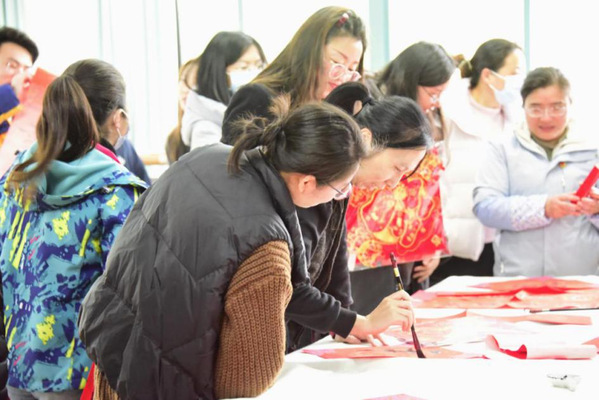 知名校友袁恩劼老师专程为本次活动书写了两副春联:松韵清流庆新年,莺歌燕舞春添喜;春鹊登枝喜盈门,艳花烂漫大地春。活动现场师生欢聚一堂,铺上对联红纸,饱蘸墨汁,用心书写春联和“福”字,一副副风格迥异的春联、一张张红红火火的“福”字,饱含着真挚的情感和对龙年的美好期盼。本次活动持续近三个小时,先后送出春联和“福”字200多套。