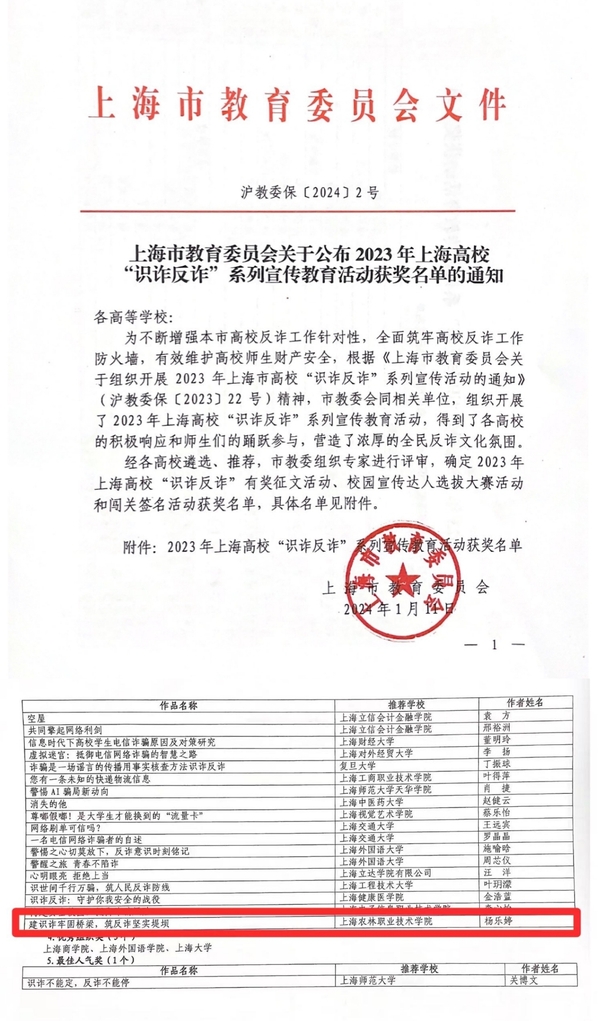 近日,上海市教育委员会公布了2023 年上海高校“识诈反诈”系列宣传教育活动获奖名单,生物医药与健康系环境221班杨乐婷获三等奖