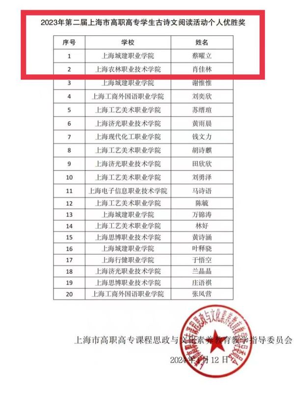 在上海市教育委员会职业教育处指导下,上海高职高专课程思政与文化素养教育教学指导委员会、上海教育报刊总社联合举办的“树职业理想 传民族精神”——2023第二届上海市高职高专学生古诗文阅读活动以经典的古典诗文、中华优秀传统文化中蕴含的职业精神、劳模精神等为主要考查内容,采取院校海选初赛、线上个人复赛和现场团体决赛的形式。根据复赛答题最终得分排名前5%的选手评选出个人复赛优胜奖20名,肖佳林最终得分位列第二名。