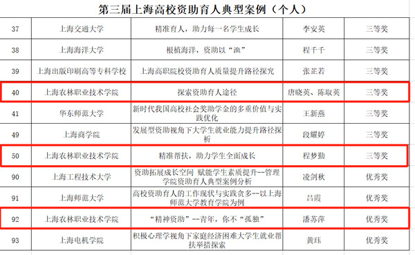 数字经济与创意系唐晓英和植物科学技术系陈取英报送的《探索资助育人途径》荣获典型案例(个人)三等奖、动物科学技术系程梦勤老师报送的《精准帮扶,助力学生全面成长》荣获典型案例(个人)三等奖。学生资助管理中心潘苏萍报送的《“精神资助”——青年,你不“孤独”》荣获典型案例(个人)优秀奖。