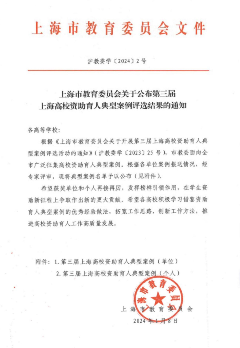 近日,上海市教育委员会公布了第三届上海高校资助育人典型案例评选结果,学院3项资助育人工作典型案例获奖。