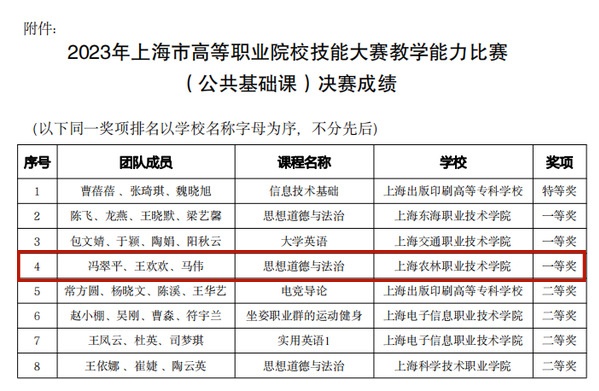 近日,2023年上海市高等职业院校技能大赛教学能力比赛(公共基础课)结果公示,经过网络初评、现场决赛等各个环节的层层选拔和激烈角逐,马克思主义学院冯翠平、王欢欢、马伟教师团队的《思想道德与法治》课程斩获决赛一等奖。