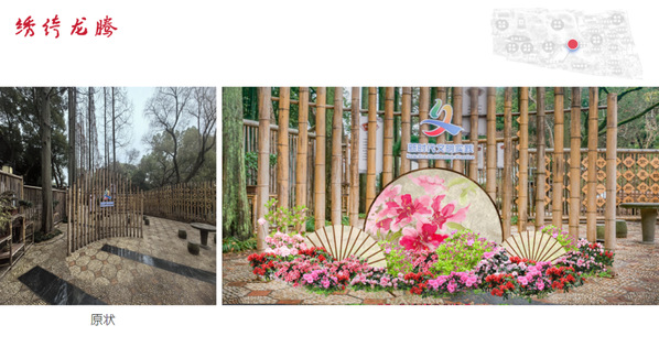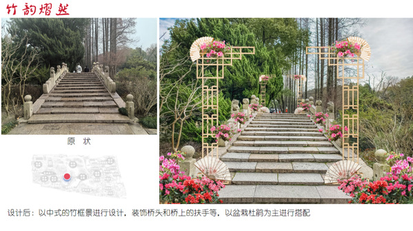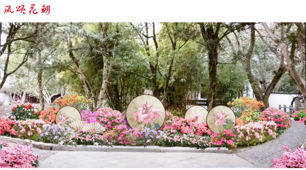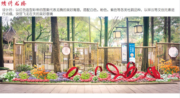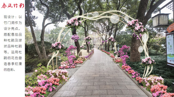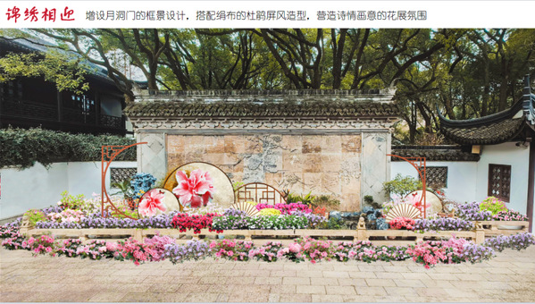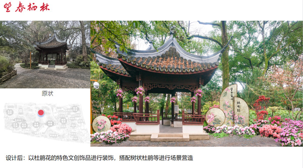 本次杜鹃展的设计充分结合醉白池的各个特色景点,融入新中式的设计元素,以“杜鹃花”的造型元素穿插进展示设计中,通过点位“芳菲华韵”、“锦绣相迎” “绣绮龙腾”、“青山画屏”等景观的设计打造2024特色杜鹃展。