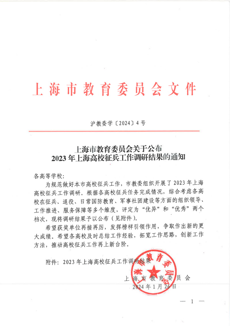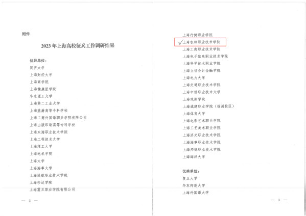 近日,上海市教育委员会公布2023年上海高校征兵工作调研结果的通知。根据各高校征兵任务完成情况,综合考虑各高校在征兵、退役、日常国防教育等方面的组织领导、工作推进、服务保障等多个维度,评定为“优异”和“优秀”两个档次,学院荣获“优异”称号。