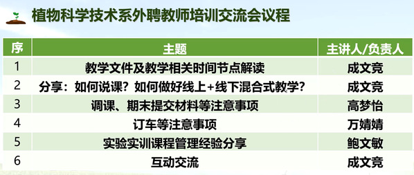 为进一步提升外聘教师的教学能力,提高系部教学质量,2月25日晚,植科系举办外聘教师培训交流会。会议由植科系副主任成文竞主持。