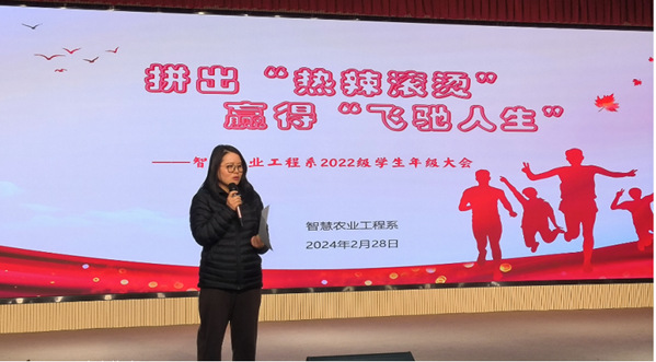 为建设优良学风,加强行为规范养成教育,有效提升学生综合素质,培育有理想信念、有优良品德、有过硬本领、有责任担当的青年学生,2月28日下午,智慧农业工程系在综合楼205报告厅召开2022级年级大会。智工系党总支副书记陆琳、副主任赵文旻、专兼职辅导员及2022级全体学生参会。会议由党总支副书记陆琳主持。