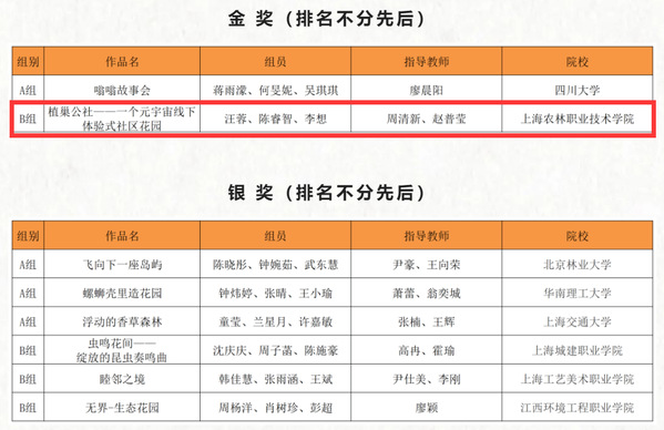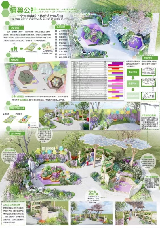 本次竞赛以“引导公众热爱植物和自然的社区花园”为命题,突出花展“满足公众园艺需求”的实施目标。《植巢公社——一个元宇宙线下体验式社区花园》设计作品通过元宇宙线上社交模式+社区花园线下参与认领的创新模式,结合生态和可持续的环保技术,探讨了一项新型社区花园设计运营模式。学生在竞赛中利用多维度开展实践应用,提升了设计表现力和实践能力。参赛学生汪蓉、陈睿智、李想,在周清新、赵普莹指导教师的一致努力下,参赛作品《植巢公社——一个元宇宙线下体验式社区花园》获得了主办方“2024上海(国际)花展组委会和《中国园林》杂志社”的一致好评。
