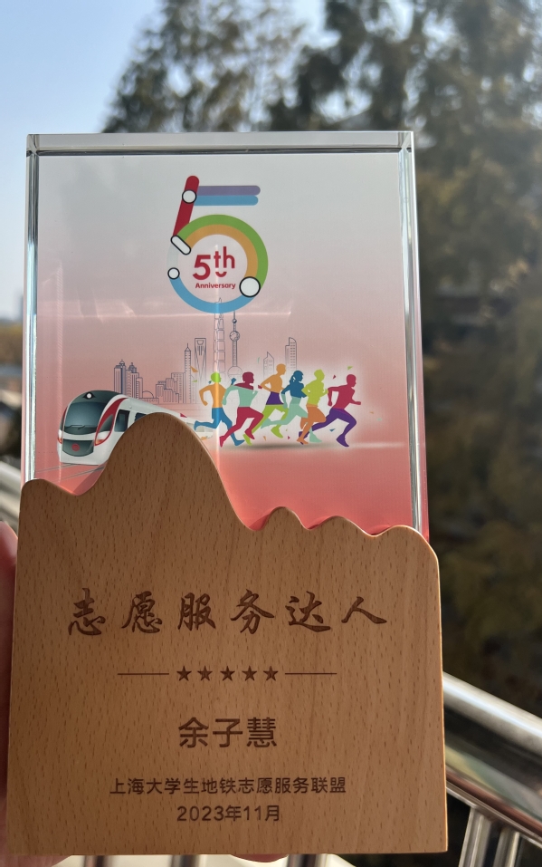 余子慧同学于2023年9月担任服务队总负责人,期间组织开展志愿者活动百余次,其中包括常规志愿者活动、暑期社会实践活动,进博会期间中山公园地铁站志愿活动等。获第五届中国国际进口博览会志愿者荣誉证书,上海大学生地铁志愿服务联盟志愿服务达人,上海农林职业技术学院2022年志愿服务先进个人,上海农林职业技术学院2023年志愿服务标兵,上海农林职业技术学院动科系2022—2023学年志愿服务标兵、优秀站长等荣誉。