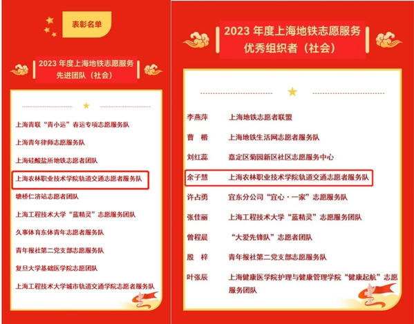 近日,上海地铁志愿者服务总队开展2023年度上海志愿服务优秀者先进评选表彰活动。我院轨道交通志愿服务队荣获“2023 年度上海地铁志愿服务先进团队”荣誉称号;动科系余子慧同学荣获“上海市志愿服务优秀组织者”荣誉称号。