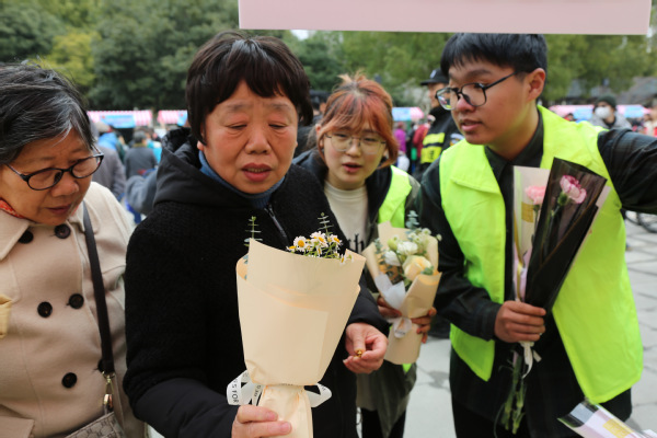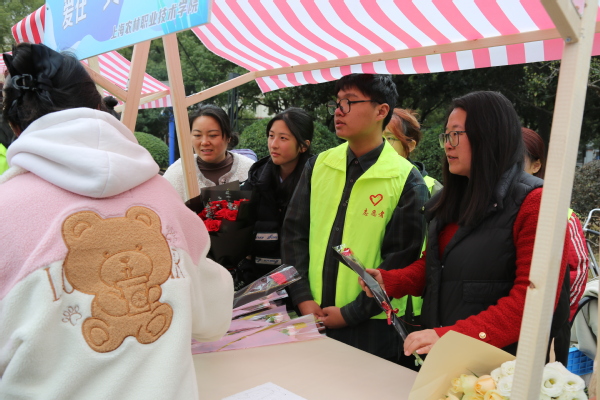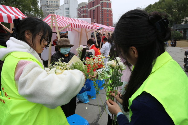 活动现场,师生们共同包装鲜花,进行义卖,吸引不少居民驻足观看,并咨询购买,本次义卖所得款项,将支持微心愿公益项目。
