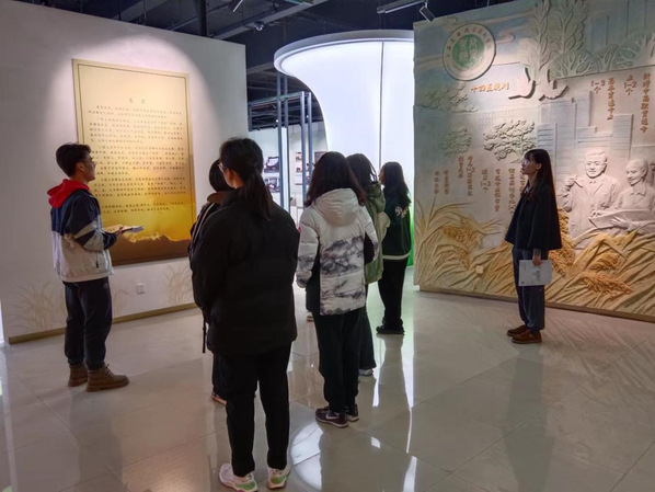 同学们首先被袁恩劼老师题写的“校史馆”三个大字吸引,进入序厅,一幅彩釉玻璃绢画展现在眼前,画面展示了校区本部第一教学楼和松江五厍实训基地的美丽景象,画面上印刻的《上农赋》首句“诞生‘七宝’地,七十又五载,沪上独一家,乃吾上农也!”充分凸显了学校在上海独特的办学地位。在“三农”之源板块,通过二十四节气动画和五幅重彩农耕国画,同学们感受到了传统农业文化底蕴。在“筚路蓝缕(1947-1978)”和“乘势扬帆(1978-2002)”板块,一帧帧黑白照片和简洁文字,讲述了学校办学历程中的艰辛与辉煌。在“生生不息”板块,L型投影与素模联动,展示了学校蓬勃生机和奋发向上的精神力量。最后,在“未来展望”板块,大型油画和学校“十四五”规划浮雕,让同学们对学院未来的发展充满期待。