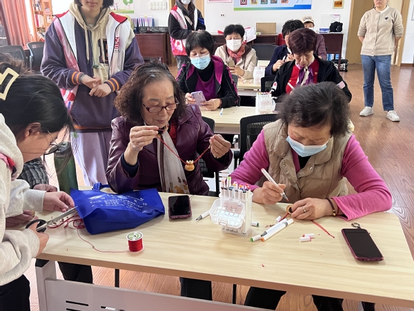 活动现场,团队成员们耐心地向社区的老年人介绍葫芦文化,并展示了如何运用彩绳、珠子等材料装点葫芦,使其焕发出新的艺术光彩。大家兴致勃勃,纷纷动手尝试,发挥想象力和创造力。