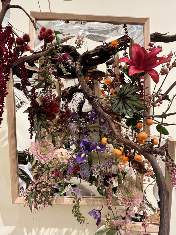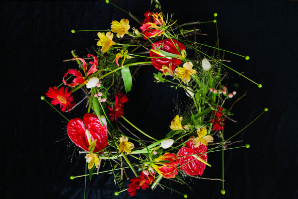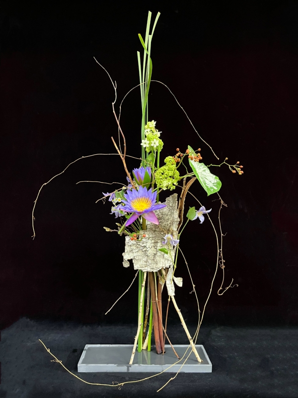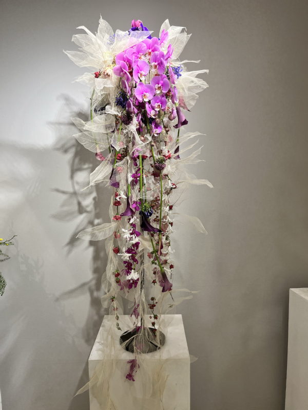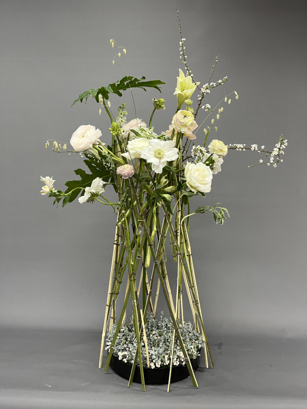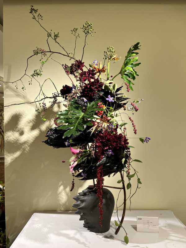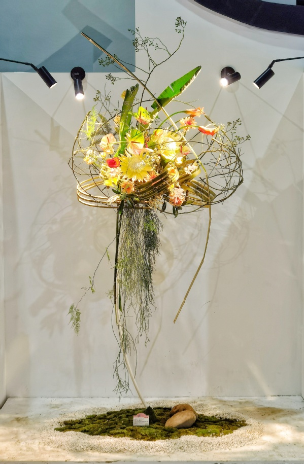 在设计花艺作品时,她不断突破惯性思维,积极寻求改变、突破、创新,利用发散思维,创作出一个个精彩的作品。在第十届中国花卉博览会获得银奖的作品,是她本人颇为满意的“佳作”。作品使用了白色的弯钩铁架,“大脑”采用了竹子的框架,以白帝王作为焦点,上花形式采用一个焦点的上花形式制作。“这个作品用一根超长的竹子在整体构图上划过,给人一种打破圆型构架的趋势,所以叫《打破思维定势的大脑》。”