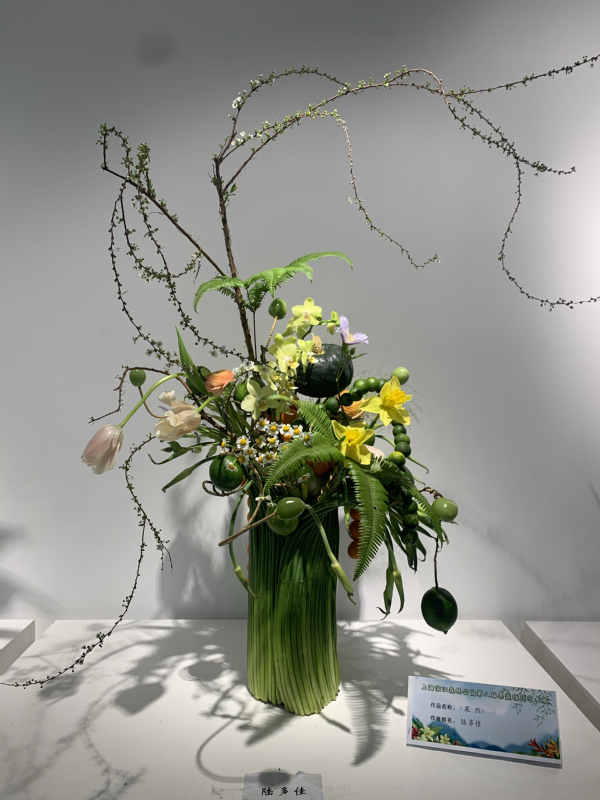 谈及第一次接触到了花艺,她说“当时要在校内选拔学生参加全国职业院校技能大赛,我抱着凑热闹的心态,就报名了。”尽管之前是零基础,可要强的她相信努力付出一定会有收获。可能是在花艺上确有天赋,也可能是学习足够努力,陆多佳在校内选拔中过关斩将,最终成功胜出,代表学校参加全国大赛,获得了中职组艺术插花项目一等奖的好成绩。