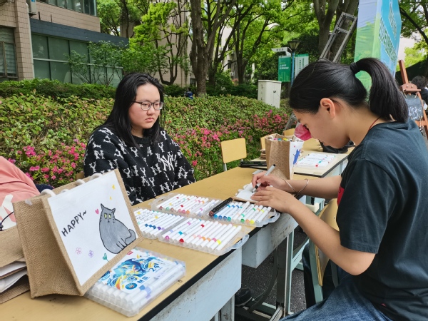 值得一提的是,本次游园会还特别设置了“美·扭扭幸福”和“美·‘涂’个开心”两个DIY区摊位。同学们在这里充分发挥自己的创意和想象力,制作出独一无二的郁金香手工艺品,或者绘制出自己喜爱的图案,将美育与心理健康完美结合。