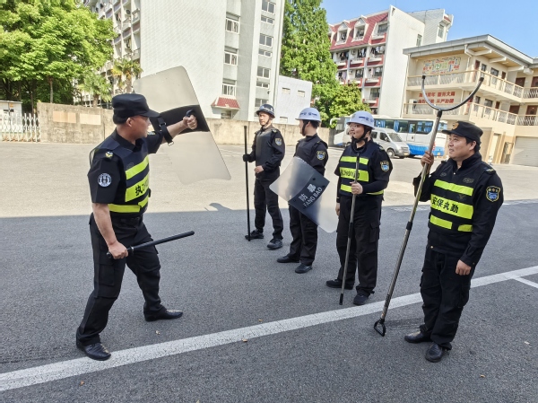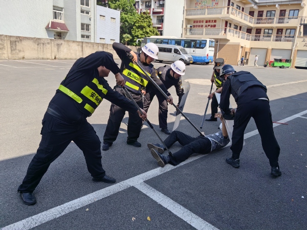 某日中午时分,值班门卫在执勤过程中发现校外社会人员手持刀具企图进入校园滋事。保安见状后立即启动应急预案,同时呼叫并组织其他保安队员携带安防装备,组成防暴队形快速出击。保安队员们利用警棍、盾牌、钢叉等手段迅速将“歹徒”制服。整个演练过程分工明确,井然有序,达到了预期的效果。
