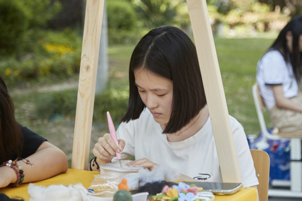 在创意艺术展区,展示了创意针织、毛毡艺术、香薰蜡烛、油画等创意文化作品,展现了同学们以独特的艺术视角,表达对生活美学和创新精神的追求。创意针织的同学为学校的流浪猫制作了逗猫小玩具;香薰蜡烛的同学通过熔化、冷却凝固、装饰等步骤DIY出个性化香薰作品;油画的同学运用画笔将江南的旖旎风光,细腻地描绘在油画布框上。