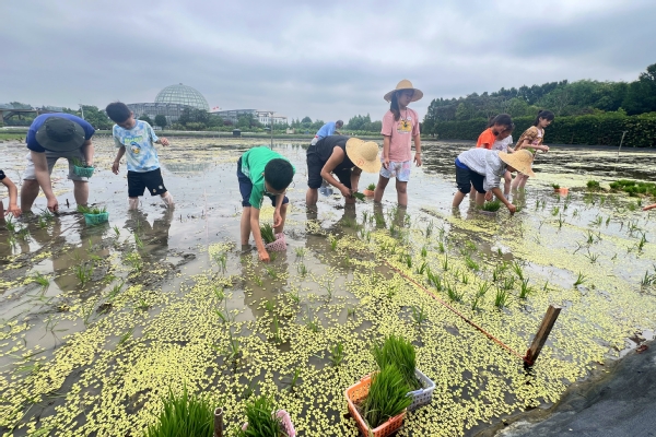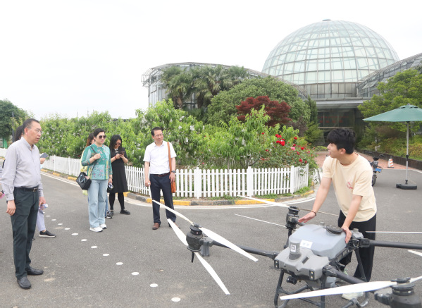 当天恰逢“职业体验日”在基地举办,校长们与参加职业体验的学生们一起观看了植保无人机喷洒作业,与参加“种稻得稻”项目的“小农人”面对面交流,询问他们的活动感受。
