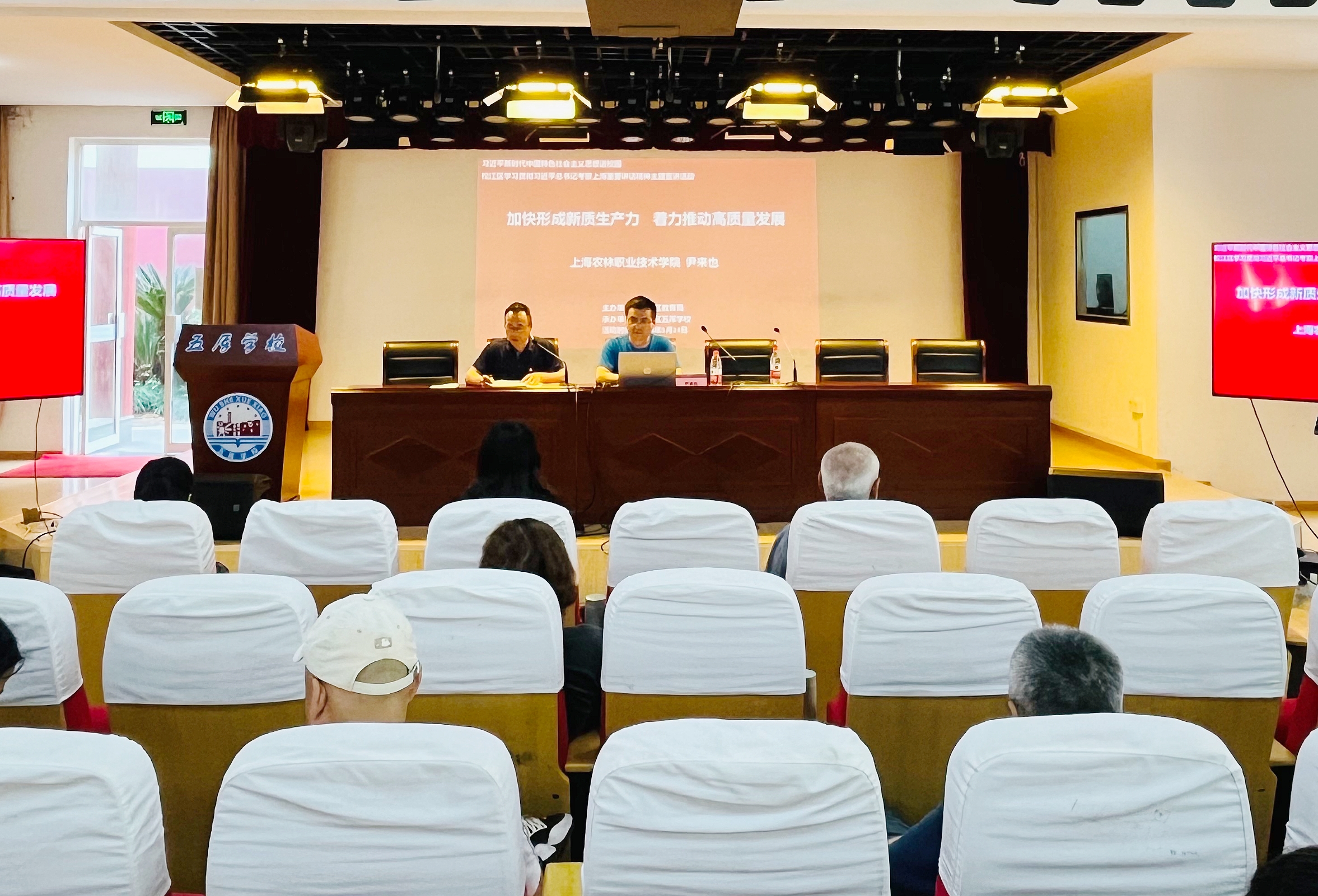 根据上海市委、松江区委的部署要求,为深入学习宣传贯彻习近平总书记考察上海重要讲话和在深入推进长三角一体化发展座谈会上的重要讲话精神,5月24日下午,马克思主义学院尹来也老师受邀前往松江区五厍学校,为五厍学校全体教职工开展题为“加快形成新质生产力 着力推动高质量发展”的专题讲座。