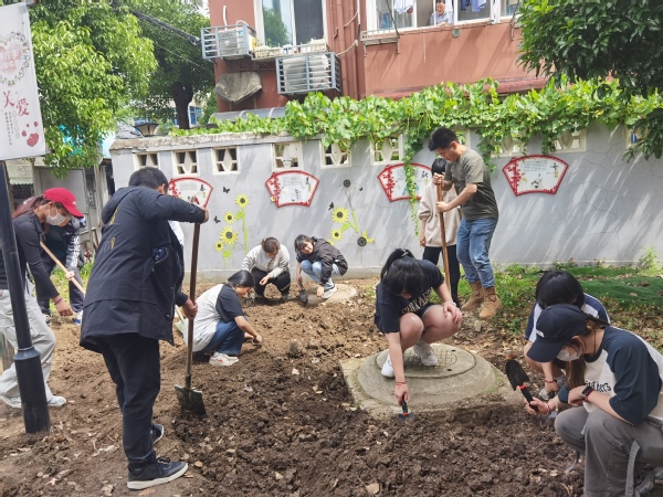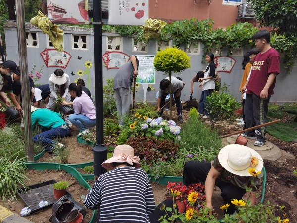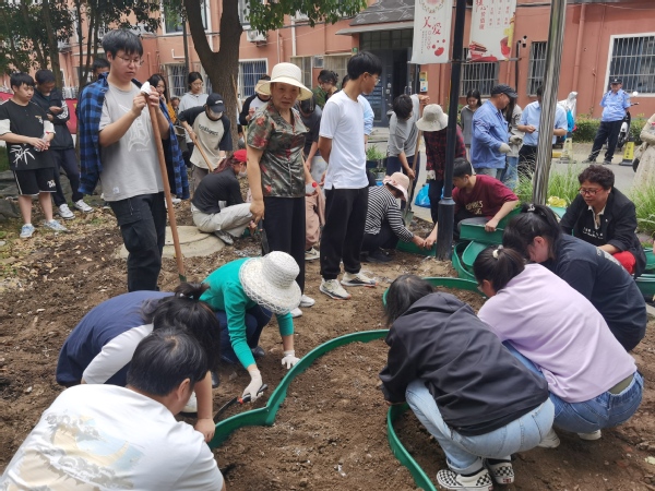 栽植现场,大家分工明确,干劲十足,整地翻土、划线与区域划分、摆花,运苗,挖坑、栽苗、填土,每个环节都井然有序,呈现出一片热火朝天的劳动景象,充分发扬了不怕脏、不怕累的奉献精神。现场氛围融洽,社区居民们也纷纷参与其中,忙得不亦乐乎。学生们三人成组、五人成团,有的扶苗栽种,有的挥锹填土,大家齐心协力,默契配合尽显团队意识,共帮助西林小区种植40余种绿植。经过一上午热火朝天的辛勤劳动,新培植的绿植展现出勃勃生机。种花是个体力活,挖坑松土费时费力,小区来往居民对大家的辛苦付出连连称赞。