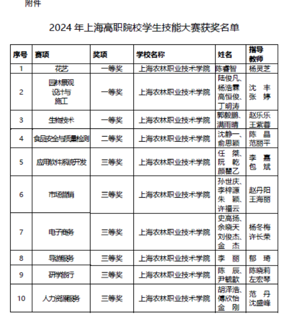 2024 年上海高职院校学生技能大赛由上海市教育委员会职业教育处、上海市教育委员会教育技术装备中心主办,于1月份启动报名工作,3-4月份举行比赛。此次比赛中,学院共组织14个参赛项参赛,并承办花艺、园林景观设计与施工、生物技术三个赛项,完成了“高标准组织、高质量实施、高水平完成”的赛事承办工作。其中,花艺、园林景观设计与施工赛项等获得一等奖和二等奖的四个赛项将代表上海参加2024年全国职业院校技能大赛。