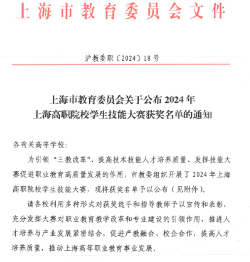 近日,上海市教育委员会公布了2024年上海高职院校学生技能大赛获奖名单,我院荣获10个奖项,其中一等奖3项,二等奖1项,三等奖6项,学生共计26人次获奖。