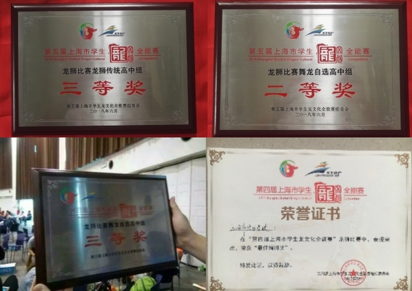 舞龙队近年在各级各类比赛中也斩获颇丰。2017年荣获第四届上海市学生龙文化全能赛高中组舞龙自选套路一等奖、舞龙传统套路三等奖;2018年荣获第五届上海市学生龙文化全能赛二等奖1项、三等奖2项;2019年荣获第六届上海市学生龙文化全能赛高中组舞龙自选项目一等奖1项、三等奖1项和龙狮传统项目二等奖1项。2021年荣获第八届上海市学生龙文化全能赛高中组舞龙自选套路一等奖;2022年荣获第九届上海市学生龙文化全能赛高中组自选套路一等奖、传统套路二等奖。