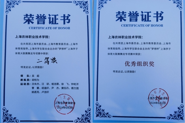 6月2日,由共青团上海市委员会、上海市教育委员会、上海市体育局指导,上海市学生联合会主办的“梦想杯”上海学子体育大联赛舞龙专项赛在上海城建学院举行。我院舞龙队与来自上海市其他高校20支代表队、260余名参赛人员同台竞技,最终荣获二等奖,学院获优秀组织奖。