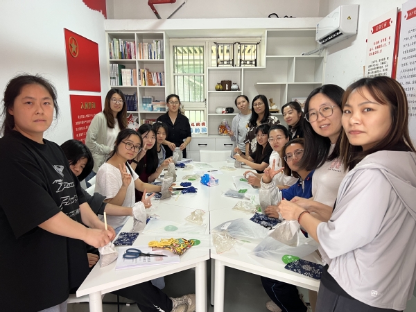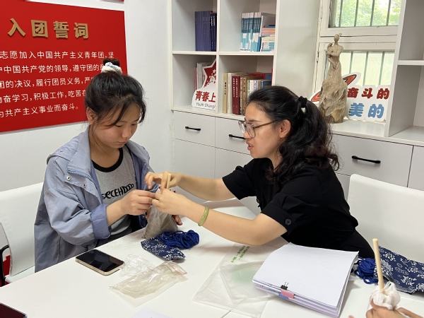 端午节作为中国最古老的节日之一,汇聚了中华民族几千年的文化精髓,支部党员潘苏萍为大家讲解了端午节的起源、习俗与精神内涵,并详细介绍了DIY艾草养生锤的制作方法。活动现场,师生们互相帮助,按顺序打开艾草包、粗布、锤柄、麻绳等,把粗布铺在桌面上,把艾草叶倒在中间,大家用力捏成紧实的球形,之后裹上带花纹的布,缠上麻绳,大家手中一个个艾草锤逐渐成形,制作出了属于自己的养生艾草锤。