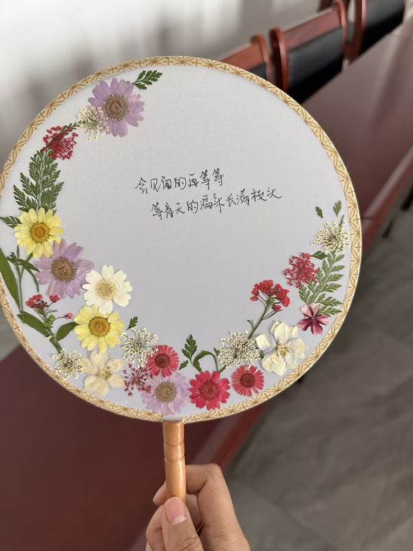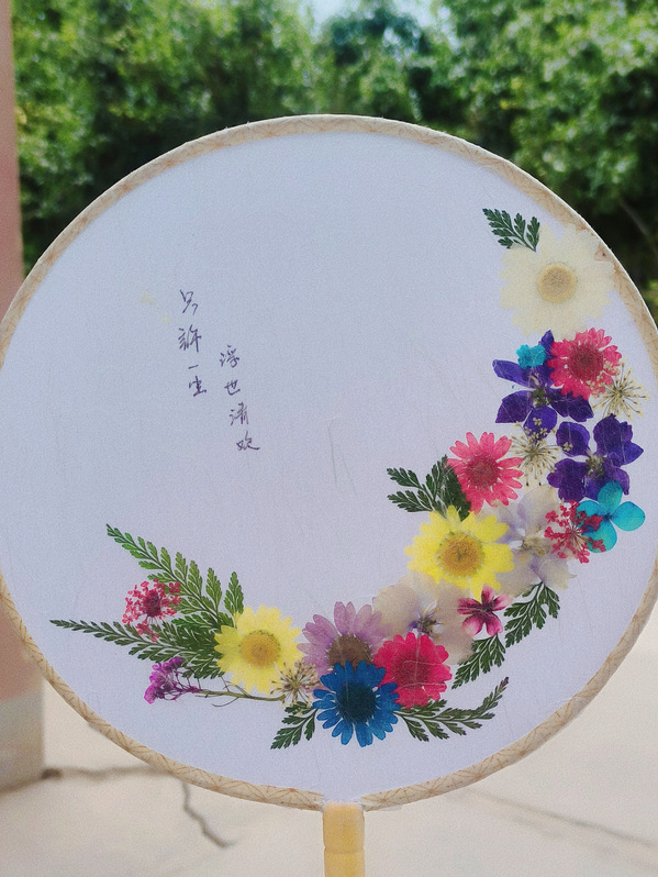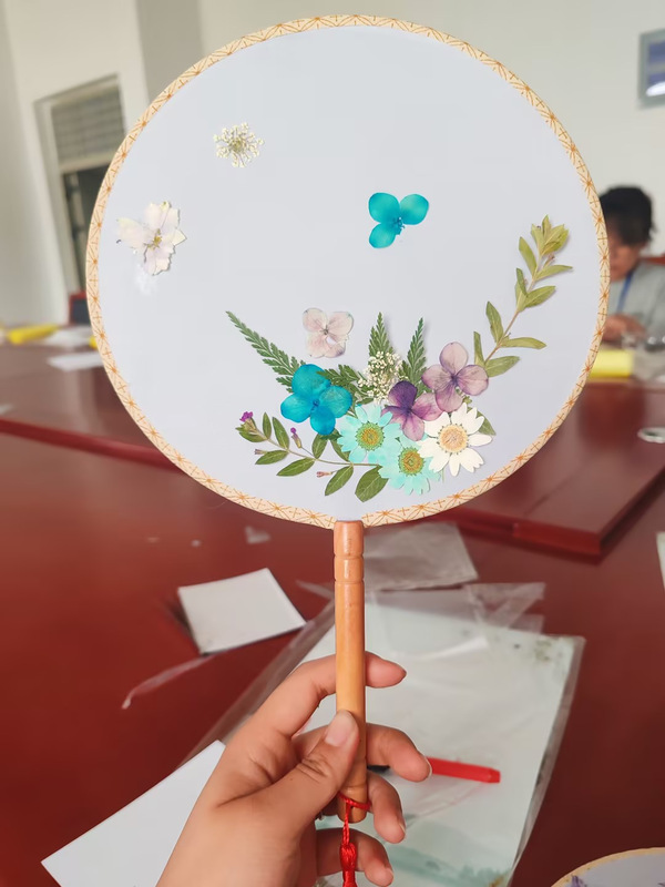 本次活动通过腾讯会议、高清视频数字展台,实现了两地远程连线实时操作展示与交流。干花材料包、镊子、剪刀、胶水等各类制作压花的工具放置于老师们面前,大家跃跃欲试,纷纷着手压花设计,制作属于自己的压花作品。“在制作团扇时,需要将材料粘在绢丝扇面上,覆膜后再用胶水涂在表层以透出花朵缤纷多彩的颜色。”植科系鲍文敏老师一边讲解,一边为大家演示制作方法,并通过视频远程为作品进行指导修改。